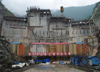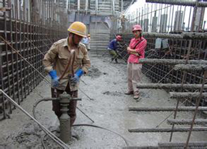 C60高標(biāo)號(hào)混凝土,其粗骨料粒徑30mm以下,級(jí)配合理;砂率39%,中細(xì)砂;以及水泥用量均能達(dá)到泵送要求。但受強(qiáng)度的制約,其水灰比在O.2-0.3之間,致使坍落度為12cm左右,影響混凝土泵送時(shí)的流動(dòng)性,增大了阻力。增加砂率能提高其可泵性,但影響了強(qiáng)度,達(dá)不到設(shè)計(jì)施工要求。因此,解決這一問題的唯一途徑就是加減水劑,既不影響強(qiáng)度,又可增大坍落度。開始泵送時(shí)未加減水劑,泵送壓力為26-28MPa,泵送速度慢、效果差。如果長時(shí)間高壓輸送,會(huì)影響混凝土泵的穩(wěn)定性和可靠性。后來摻入一定量的減水劑(NF-2),坍落度達(dá)到18-20m,泵送壓力明顯下降,僅為18MPa左右,使泵送工效提高約一倍。另外,在泵送過程中,還應(yīng)提醒操作人員:料斗內(nèi)的混凝土務(wù)必在攪拌軸中線以上,否則會(huì)導(dǎo)致吸空造成混凝土四處飛濺傷人,或由于吸空、氣體壓縮而造成堵管。