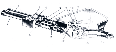 (1)(2)主油缸;(3)水箱; (4)換向裝置;(5)(6)混凝土缸; (7)(8)混凝土活塞 ;(9)料斗;(10)分配閥 ;(11)擺臂; (12)(13)擺動油缸;(14)出料口