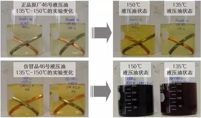 鑒別液壓油的真?zhèn)慰梢院?jiǎn)單的通過(guò)觀(guān)察油的顏色來(lái)判斷,仔細(xì)查看液壓油是否存在顏色過(guò)深、渾濁、有雜質(zhì)等情況。為了更直白,我們找來(lái)了專(zhuān)家分別將46號(hào)純正液壓油和偽劣液壓油分別放置在135°、150°的高溫下進(jìn)行實(shí)驗(yàn),實(shí)驗(yàn)結(jié)果顯示無(wú)論是135°還是150°,純正液壓油顏色都不會(huì)發(fā)生大的變化,仍然是透明油黃色;而仿冒液壓油在高溫環(huán)境下顏色會(huì)變深變黑。