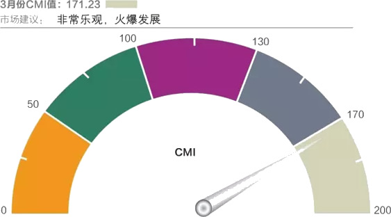 2017年3月份中國工程機(jī)械市場(chǎng)指數(shù)即CMI為171.23,同比增長25.66%,環(huán)比增加57.66%。2017年3月份中國工程機(jī)械市場(chǎng)指數(shù)比上月提高62.62點(diǎn),比上年同期提高34.97點(diǎn),同比、環(huán)比繼續(xù)增長,而且也創(chuàng)下了2011年7月CMI指數(shù)創(chuàng)立以來的高值。