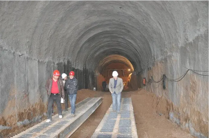 隧道混凝土是采取邊開挖邊襯砌的方式完成的。開挖后先用噴射混凝土作為初期支護,之后搭設鋼筋網(wǎng),用毛桿固定鋼筋網(wǎng)。之后才可以進行二襯。